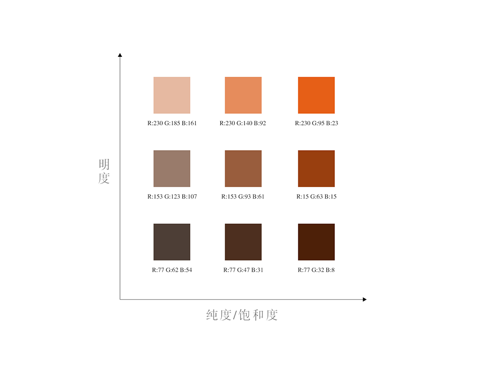不同的橙色表現出不同的調性,黯淡的橙色其實已經可以看作沉穩的褐色,而明亮的鮮橙色又分外跳脫