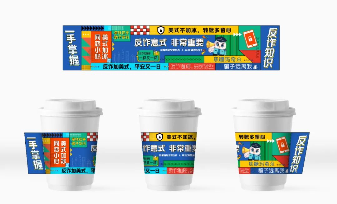 1、因為反詐和杯套其實是毫不相干的,所以我在想有沒有什么說法可以讓二者產生關聯,使得在杯套上做反詐會很自然,后來我想到了一句話:反詐有一“套”。設計方面把它作為主題進行突出,然后加上反詐IP和幾句反詐的口號,就可以了。