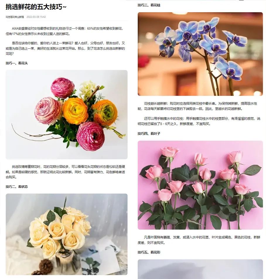 2、我們還可以想想買花的人會關心什么問題。比如怎么選花?怎么讓花能更持久地保鮮?所以我們可以寫一篇圖文、錄制一段視頻,或者做一本手冊專門教大家怎么選擇新鮮的花、好看的花、有意義的花,怎么延長花期等等。