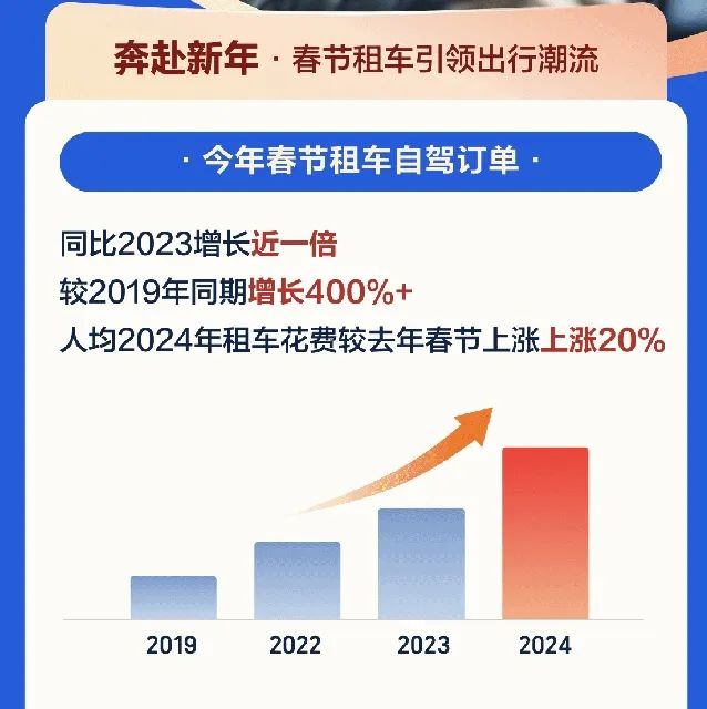 攜程租車的《2024年春節租車自駕游報告》則顯示,今年春節,國內租車自駕訂單量比去年增長近一倍,較2019年春節增長超400%。不僅租車的人變多了,客單價也漲了20%,達到3020元。