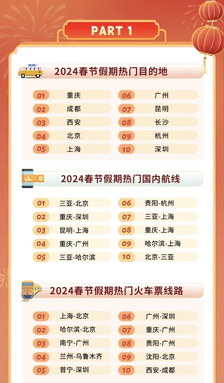 那么,縱觀偌大的中國,大家更偏好去哪些地方呢?在飛豬發布的《2024春節假期出游快報》中,“南北互換”成為關鍵詞。快報顯示,今年,飛往廣東、海南、福建等南方地區溫暖過年的“避寒游”,以及飛往黑龍江、吉林、河北等北方地區的“過雪年”最為火爆,預訂量同比去年增長105%。