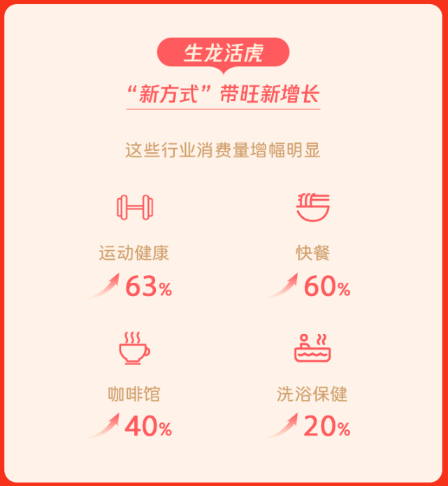 在消費結構上,消費者新的生活方式拉動了新增長。微信聯合同程旅行發布的《龍年春節消費“新意”觀察》顯示,2024年2月9日-2月15日,運動健康行業消費量同比增長63%。在此期間,咖啡消費量同比增長40%,隨著年輕人返鄉和用戶消費習慣的變化,“洋氣”的咖啡逐漸成為春節消費場景的重要角色。很多返鄉過年的年輕人驚喜地發現,小縣城也開出了瑞幸等咖啡店,下沉市場正在發生咖啡供給與咖啡需求的雙重增長。