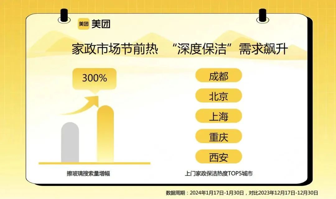 隨著消費者消費意識和生活方式的轉變,多種新型生活服務消費在春節期間走俏。中國人習慣在春節前進行房屋大掃除,但如今更多人用家政服務替代自己打掃。美團數據顯示,1月17日至1月30日,深度保潔團購訂單環比增長130%,擦玻璃搜索量較前一個月同期激增300%。