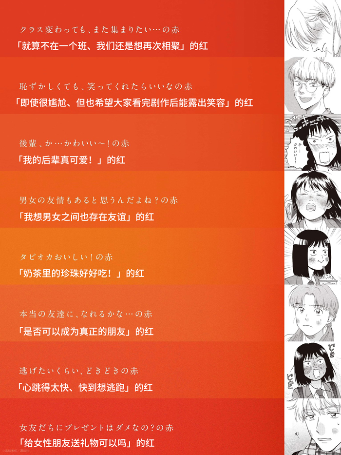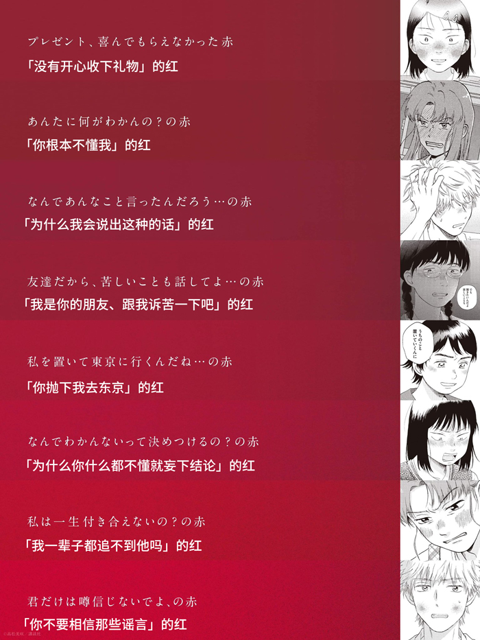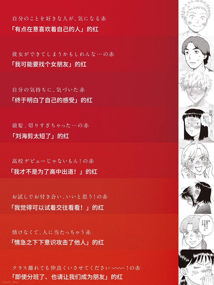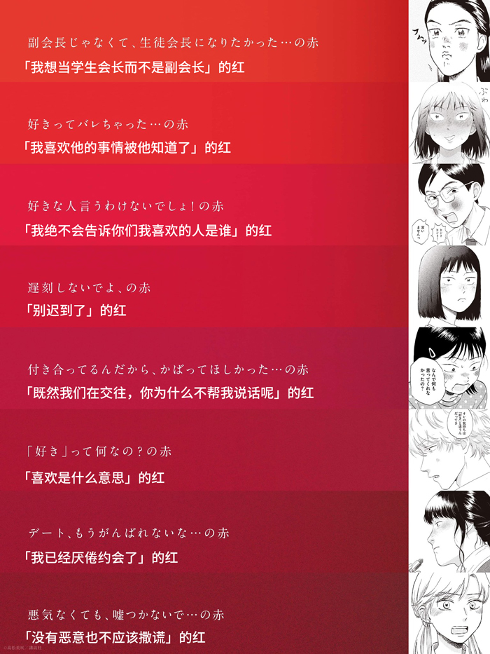 現在,為紀念3月22日最新一卷(10卷)的發行,講談社在東京澀谷地鐵站張貼了鮮紅色的海報,名為“37色腮紅廣告”。廣告的標語是“當你變紅時,你還年輕”,把變紅的臉看做是“青春的時刻”,用37種不同色調的“紅”去表達喜悅和悲傷,比如“紅讓我想逃跑”、“他不討厭和我一起出去玩”。