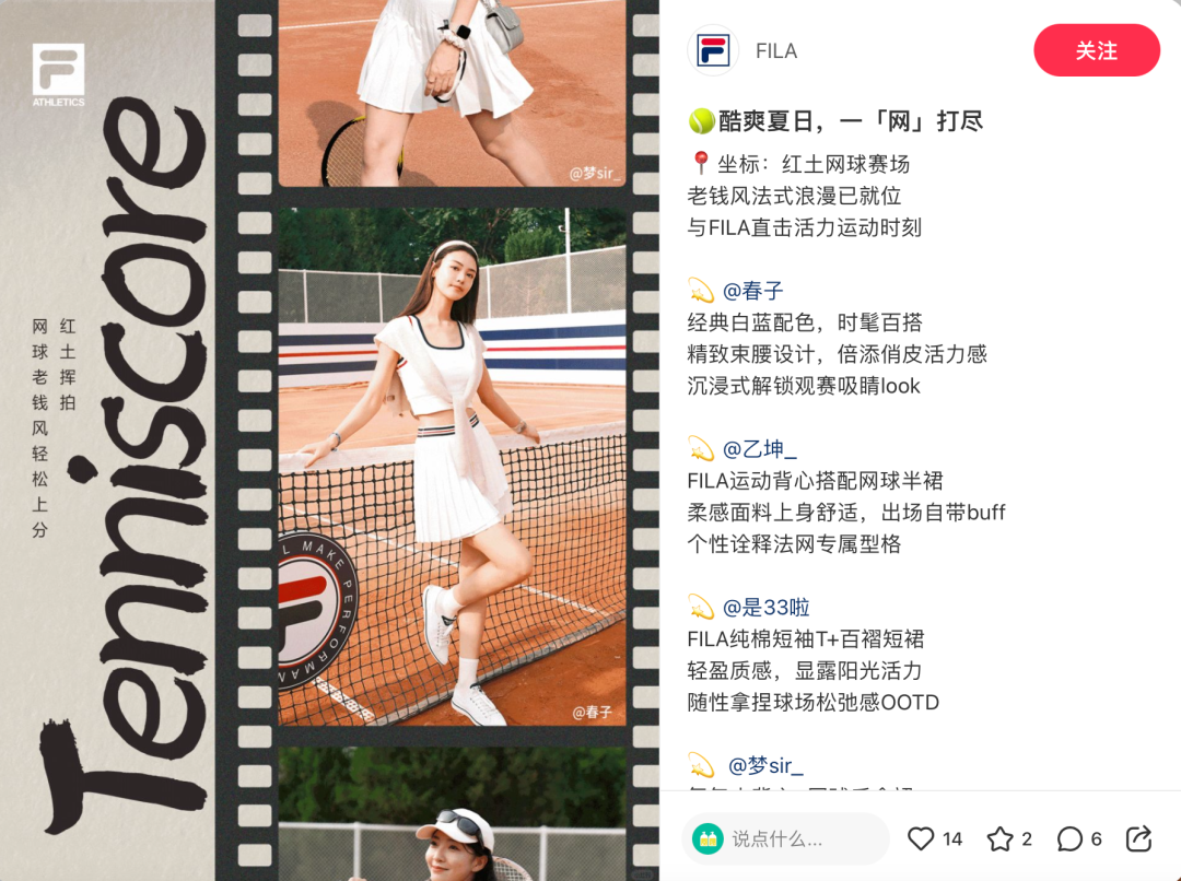 在小紅書,FILA相關筆記已超過33萬篇。不少年輕人被網球老錢風、明星同款種草,想從時髦優雅的運動穿搭中,享受恰到好處的松弛感。有網友開展運動穿搭的攻略分享,把FILA單品搭配出更多時尚風格,作為“炸街”的流量密碼。