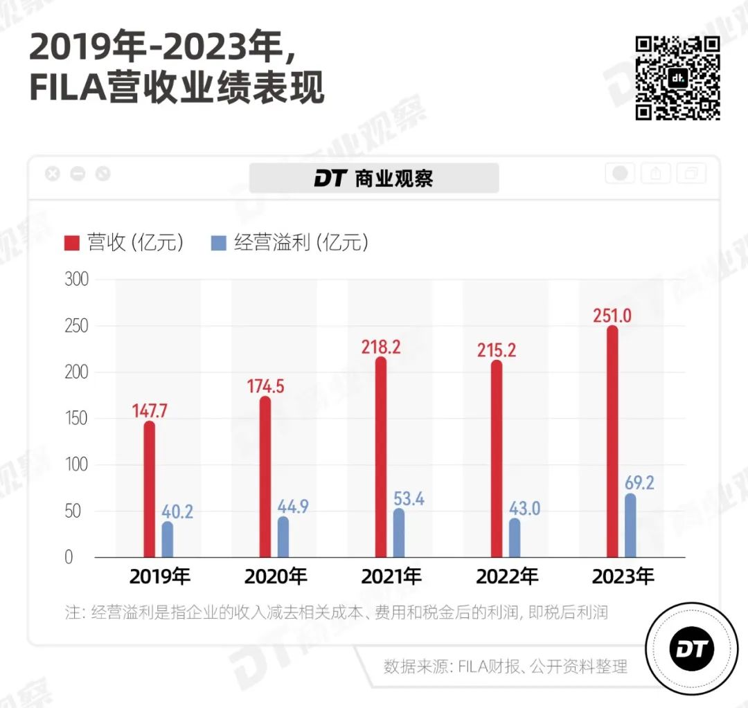 財報顯示,2023年全年FILA收益增長16.6%至人民幣251.03億元,經營溢利增幅高達60.8%(經營溢利是指企業的收入減去相關成本、費用和稅金后的利潤,即稅后利潤)。
