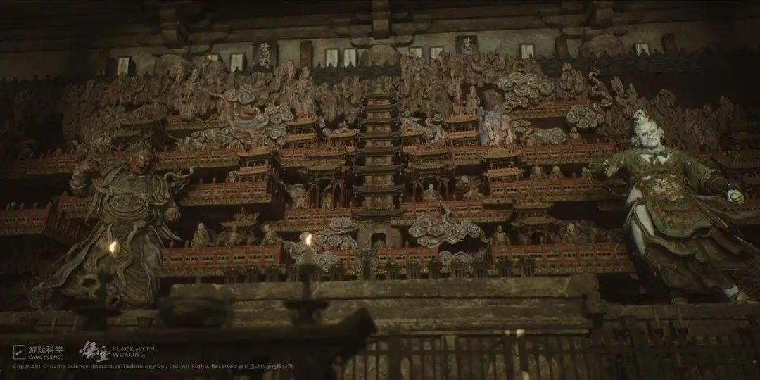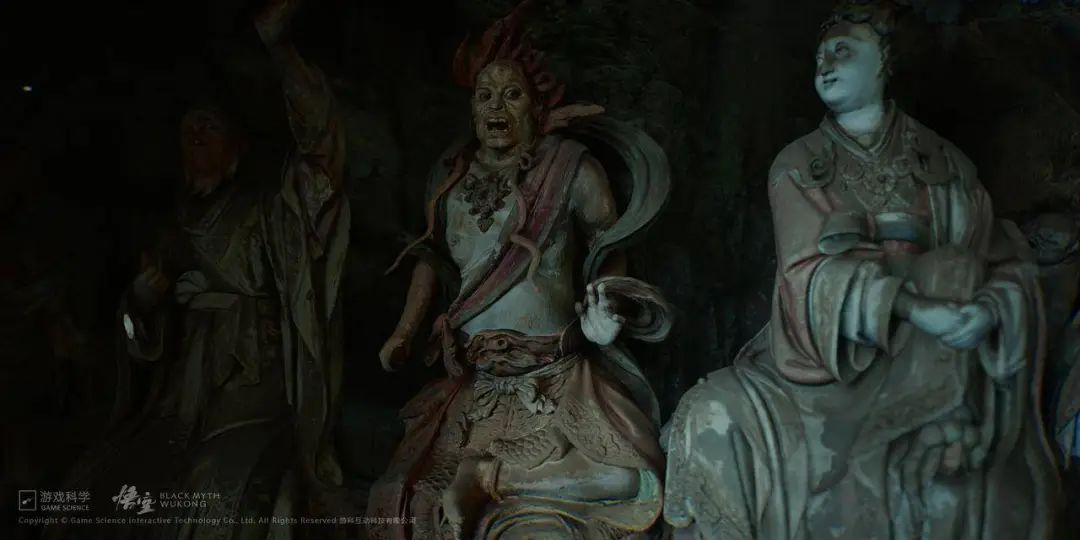 通過實景掃描等手段在全國各地取材,《黑神話:悟空》中收錄了大量源自山西、川渝等地的經文掛畫、佛像廟宇,讓現實存在的中國文化古跡融會貫通,成為游戲的一部分。這一方面降低了創作的強度、提升了研發效率,另一方面,也強化了游戲本身的文化屬性,而究其根源,在于西游文化在全國各地根深蒂固的文化影響。