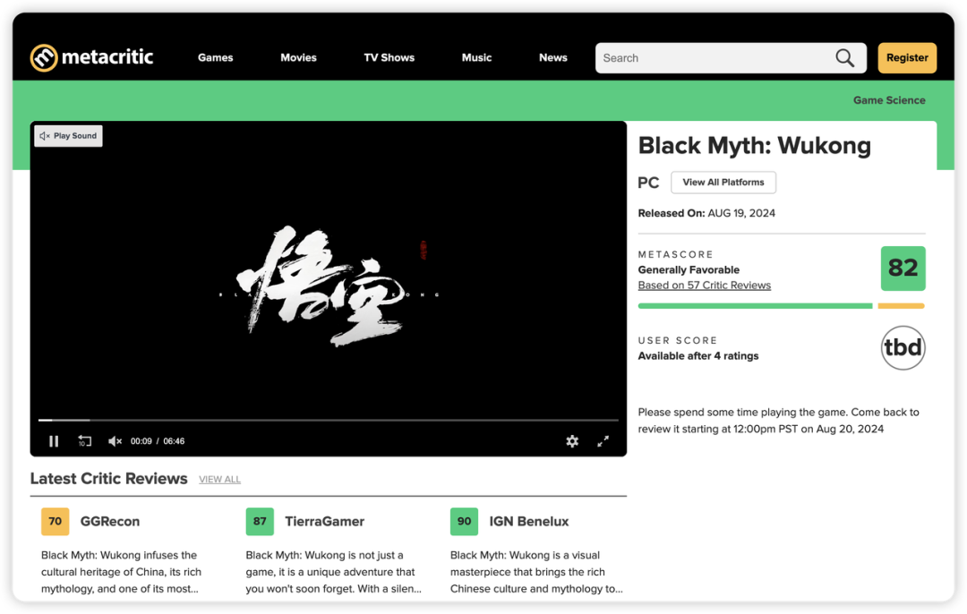 截止至《黑神話:悟空》上線前夕,綜合評分網站 metacritic 對于本作的評分為 82 分,共收錄了全球 49 家核心媒體評分,在 2024 年的動作游戲里可以排得上前幾名——這對于一個沒有 3A 游戲開發經驗的初創團隊而言,是尤為難得的成績。