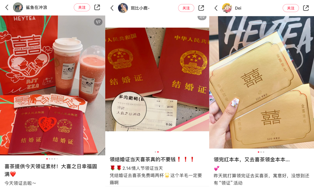 喜茶自2022年起,正式推出了“喝喜茶,領喜證”的活動,持續在情人節、520、七夕等節點,為情侶、新人帶來更具儀式感的祝福。