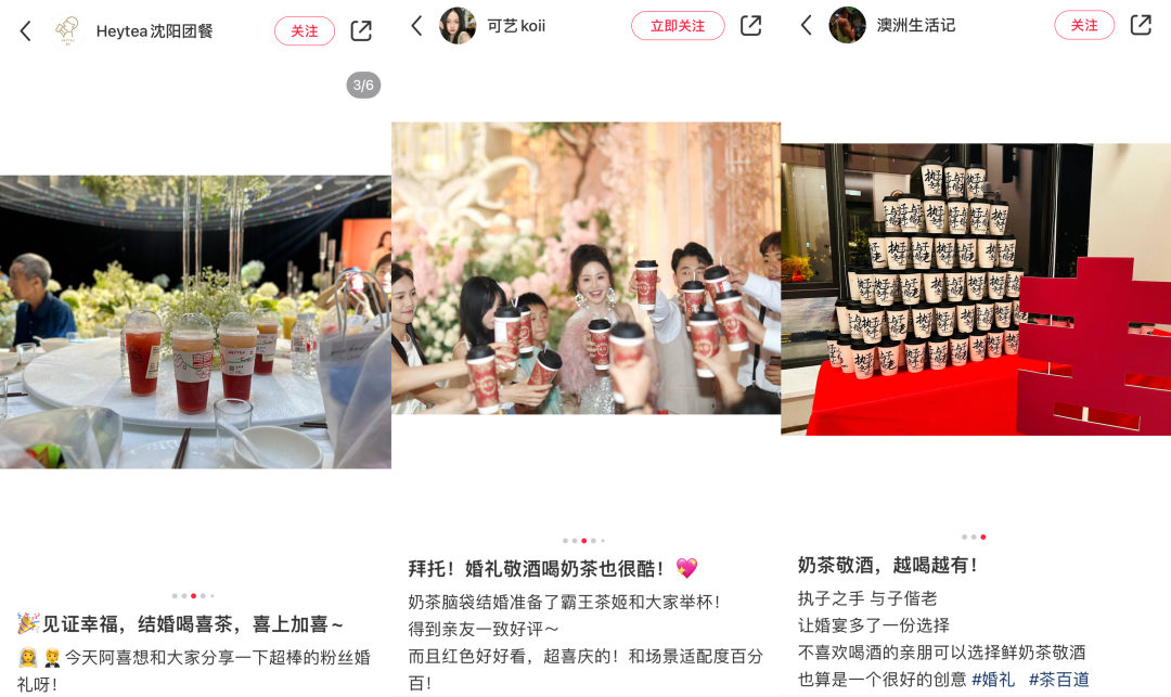 小紅書上不斷有網友分享婚宴上用奶茶敬酒的瞬間。新茶飲除了能代替酒水,也能傳遞美好,比如喜茶的“喜”與“囍”字同音,放在婚宴上有很好的寓意,結婚喝喜茶更是囍上加喜;霸王茶姬的大紅色定制杯也非常適合喜慶的場景,和婚禮的適配度極高;茶百道在23年七夕推出的限定表白杯上印有“執子之手”“與子偕老”等字樣,也正好被用來擺在婚宴上增添喜氣。