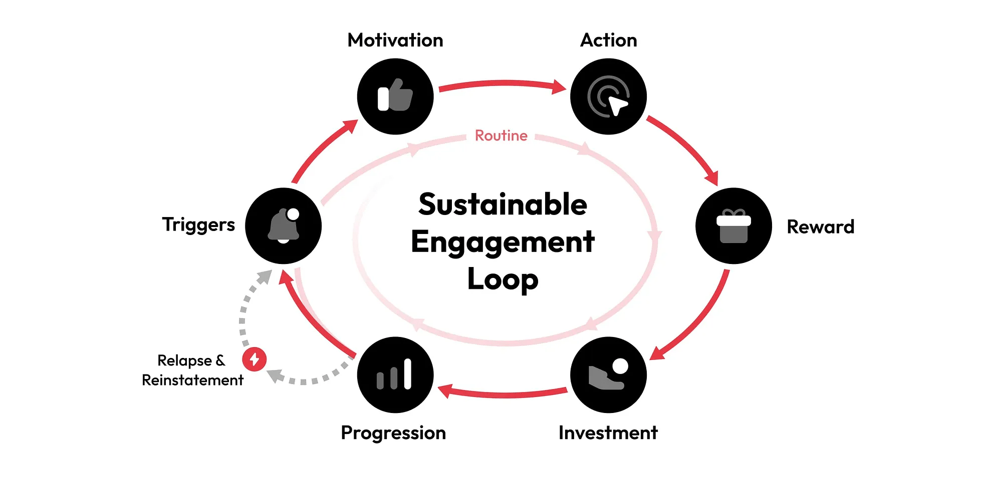 「可持續參與循環」是一種行為模式,旨在通過建立和保持習慣的循環過程促進用戶的長期參與。該模型圍繞六個關鍵階段展開:
