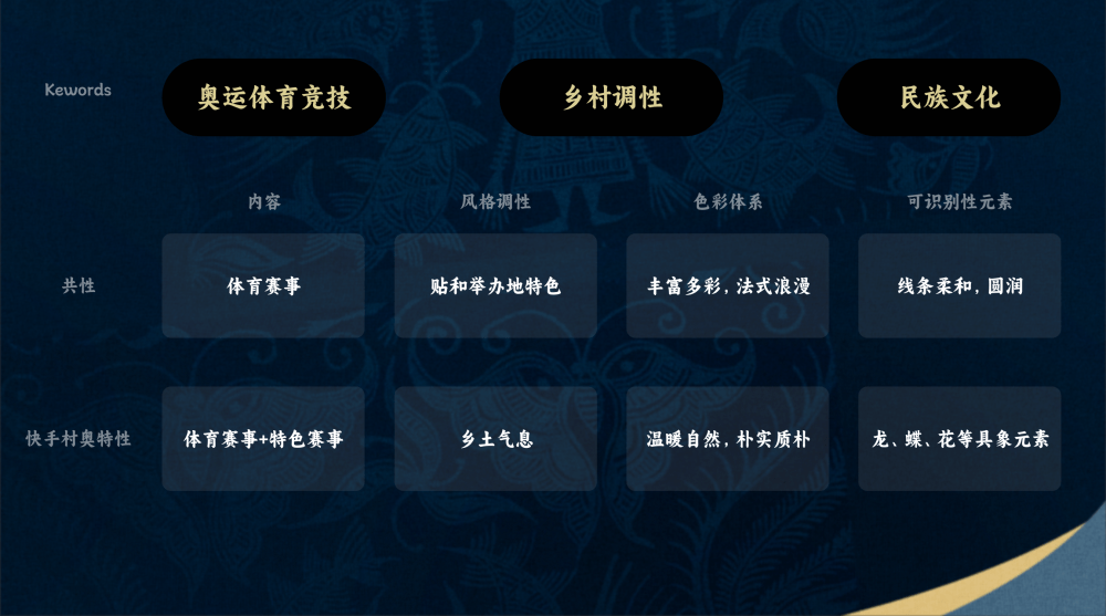 通過以上對比,結合共性與特有性,我們就找到了本次快手村奧的設計創意方向: