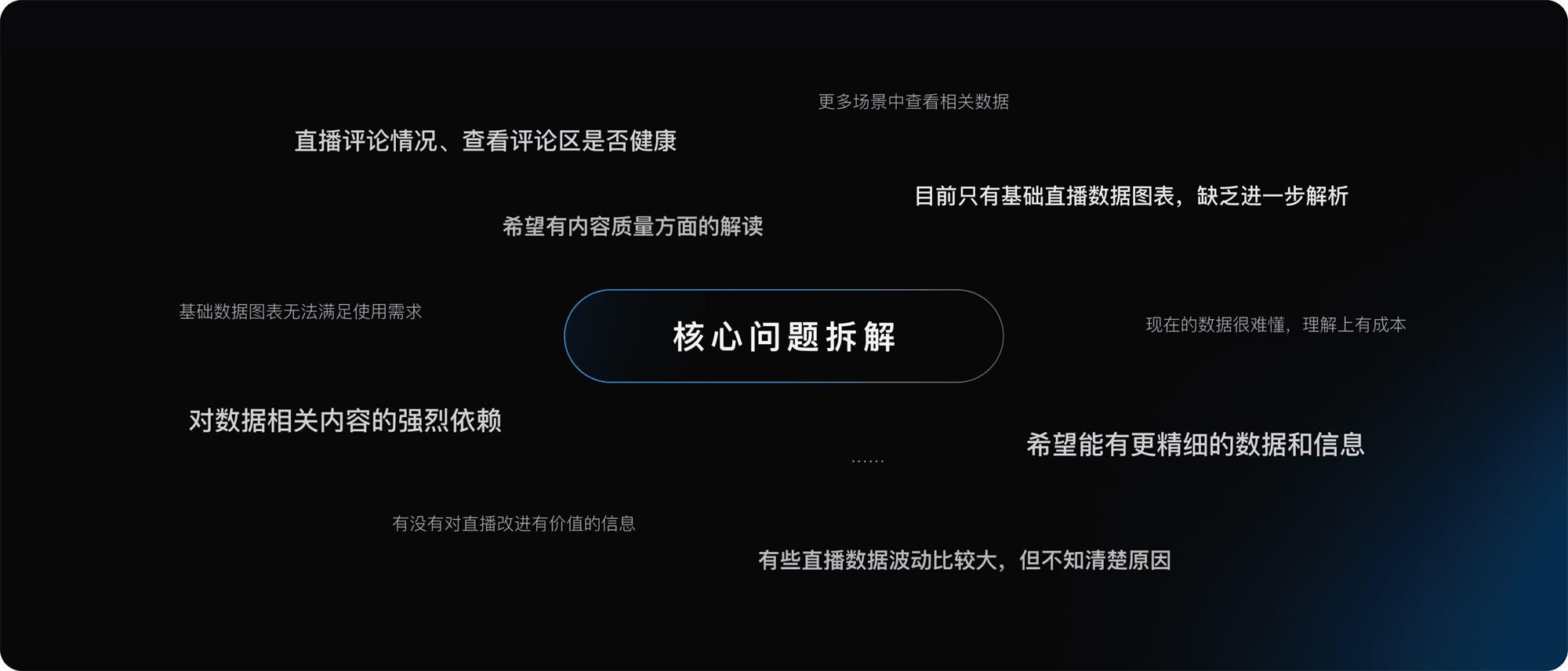 通過階段性用戶調研我們進一步深入了解直播運營同學的操作流程,綜合線上流程體驗分析。發現除了基本的數據觀測外,還有更多的數據場景沒有被滿足,以此定位了幾個核心問題: