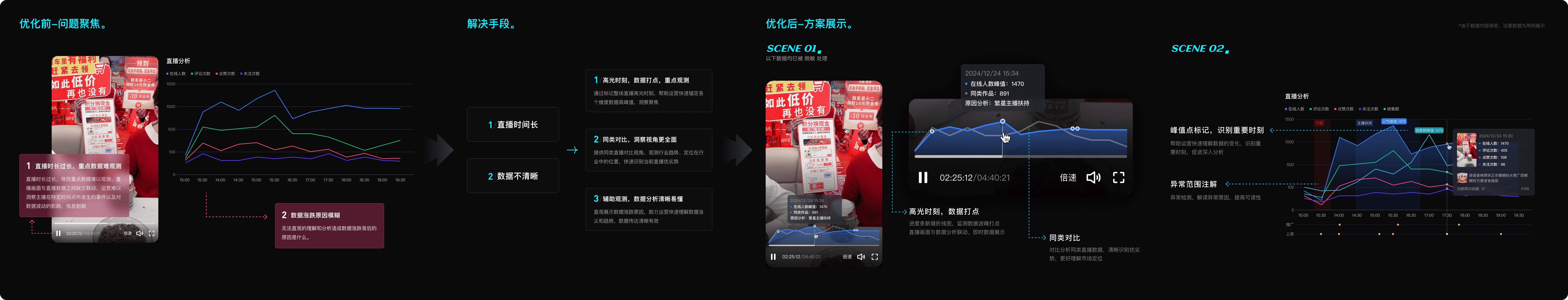直播時長過長,重點數據難觀測:在直播場景中,直播時長通常較長,導致重點數據難以觀測。此外,直播畫面與直播數據之間缺乏聯動,使得運營難以準確洞察主播在特定時間點所發生的事件以及其對數據波動的影響,導致信息割裂;