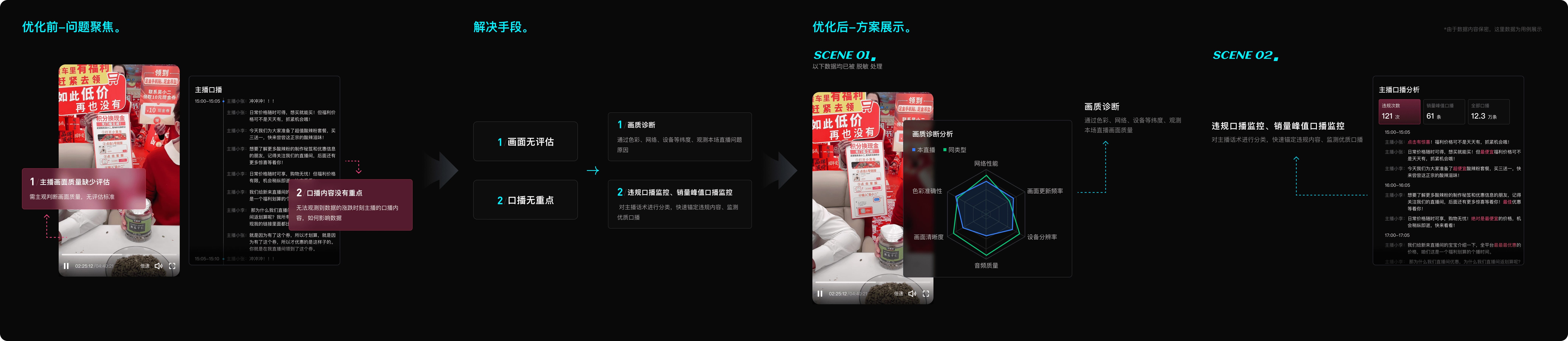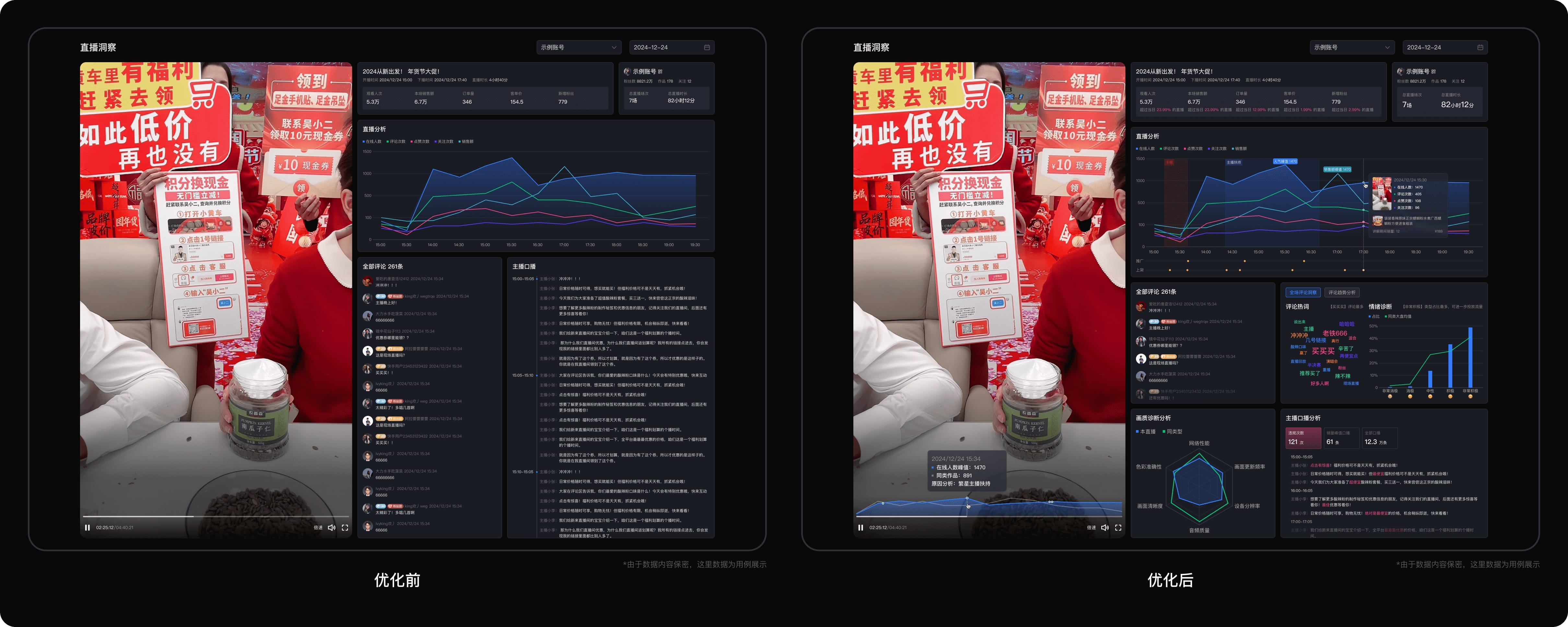 通過對主播表現模塊進行數據打點重點觀測,提供統一的內容質量診斷標準,監控違規口播和銷量峰值,以及實現互動參與可視化和情緒診斷等設計優化策略,我們可以將復雜信息直觀展示,從而提升直播數據的可讀性,增強運營對直播間數據的理解,促進多維度深入分析,減少主觀判斷的影響,加快決策過程,從而提升運營洞察工具的質量和效率。