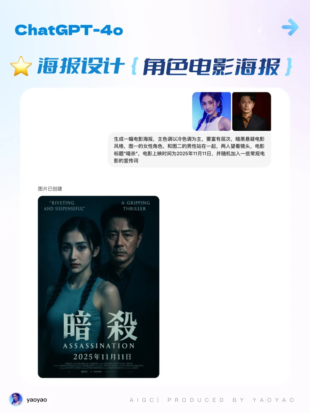 生成一幅電影海報,主色調以冷色調為主,要富有層次,暗黑懸疑電影風格,圖一的女性角色,和圖二的男性站在一起,兩人望著鏡頭,電影標題"暗殺”,電影上映時間為 2025 年 11 月 11 日,并隨機加入一些常規電影的宣傳詞