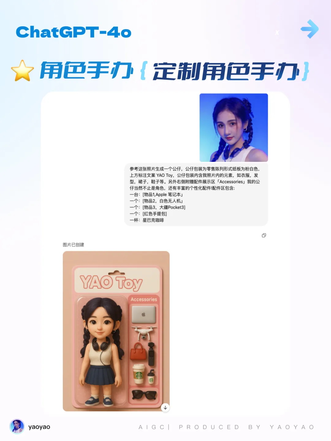 參考這張照片生成一個公仔,公仔包裝為零售陳列形式紙板為粉白色,上方標注文案 YAO Toy,公仔包裝內含我照片內的元素,如衣服,發型,裙子,鞋子等。另外右側附贈配件展示區「Accessories」我的公仔當然不止是角色,還有豐富的個性化配件!配件區包含: