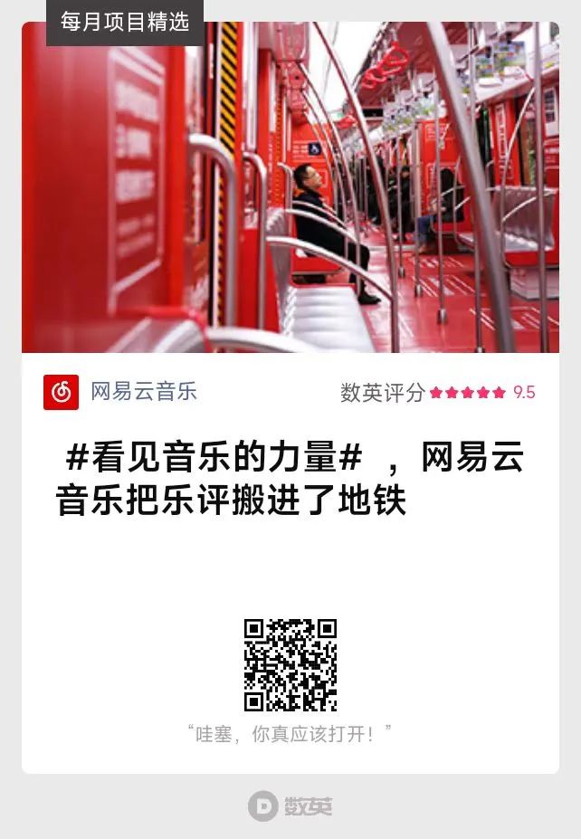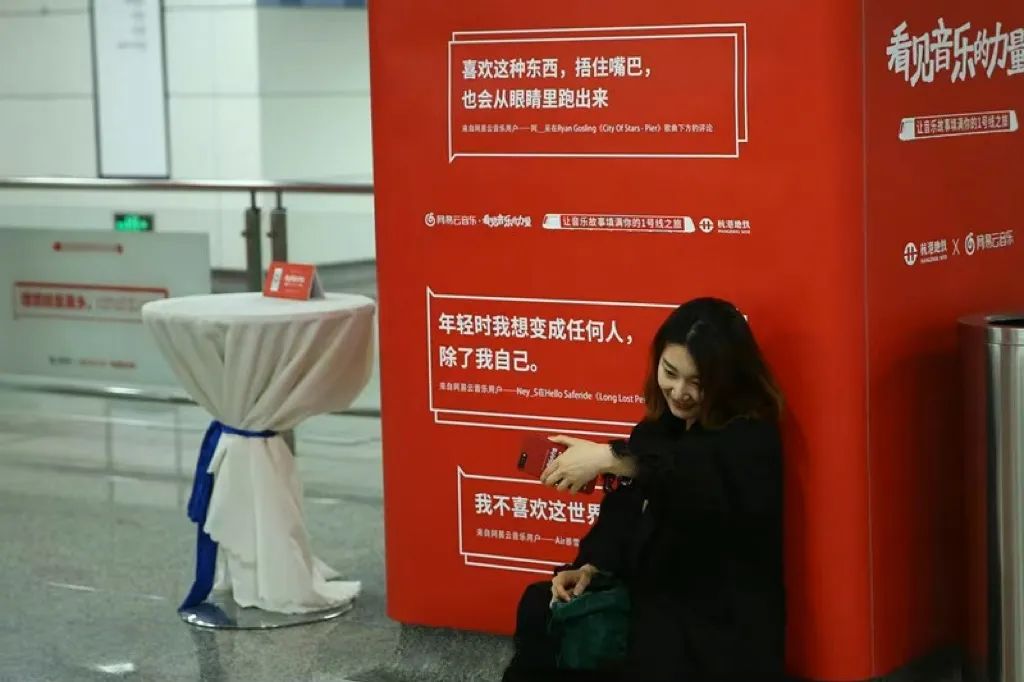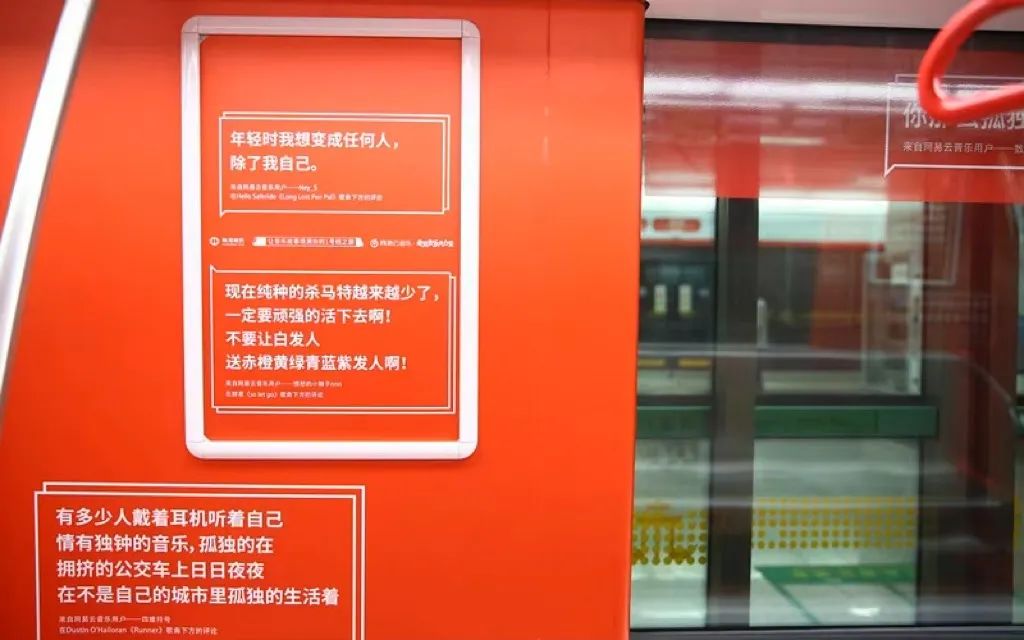 2017年,一輛刷滿紅白顏色的地鐵駛入大眾眼簾,也走進大眾心中。網易云音樂將社區中高贊且帶有濃郁情感的評論置于地鐵內,借助封閉的空間和夜晚的場景讓情緒感染加速。