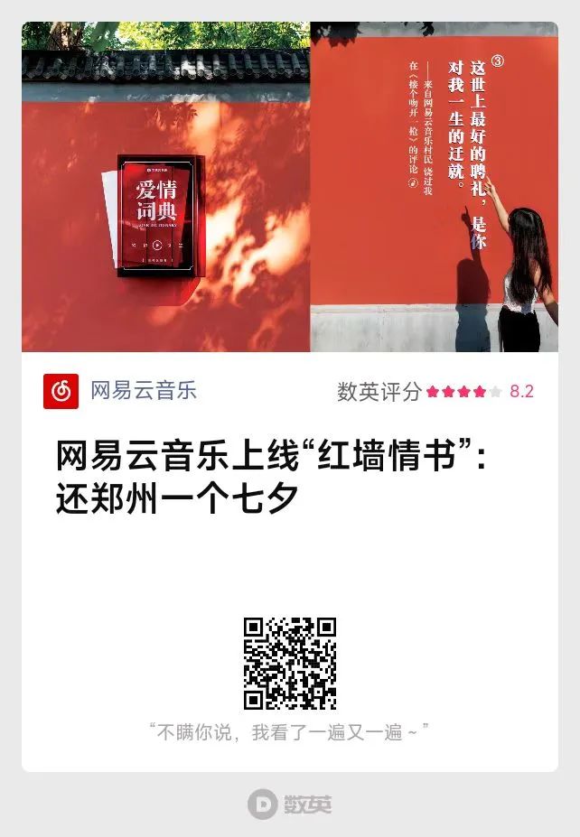 同年9月,因為一場暴雨錯過的七夕,網易云音樂把浪漫給補上了。雨過天晴,在鄭州“連心里”胡同,網易云音樂用20條樂評組成一本《愛情詞典》,從曖昧、相知到婚姻,這些感人瞬間被印刻在紅墻上,陪著人們找到愛情的答案。