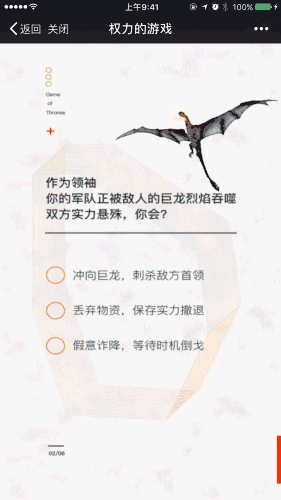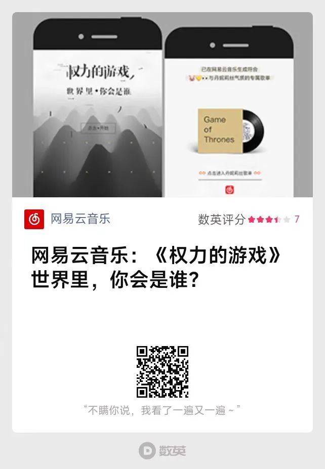 《權力的游戲》快要進入終章時,網易云音樂巧妙借勢,以6道測試題調動粉絲情緒。精細的UI設計,伴著冰原狼的嚎叫和巨龍振翅的響聲,沉浸式的劇情氛圍和妥帖對應的角色歌單,誠意之下,更讓用戶看到了云村內豐富的歌單資源。
