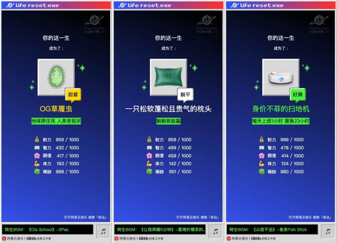 4月1日愚人節,是各大品牌腦洞大開的時候。針對年輕人“內卷、躺平”的社會情緒,網易云音樂把主意打在了人的命運設定上,給人一次“重生”的機會。當“命運”這類宏大的主題被解構,當生活壓力以詼諧戲劇化的方式化解,人心的活力則得以滋生。