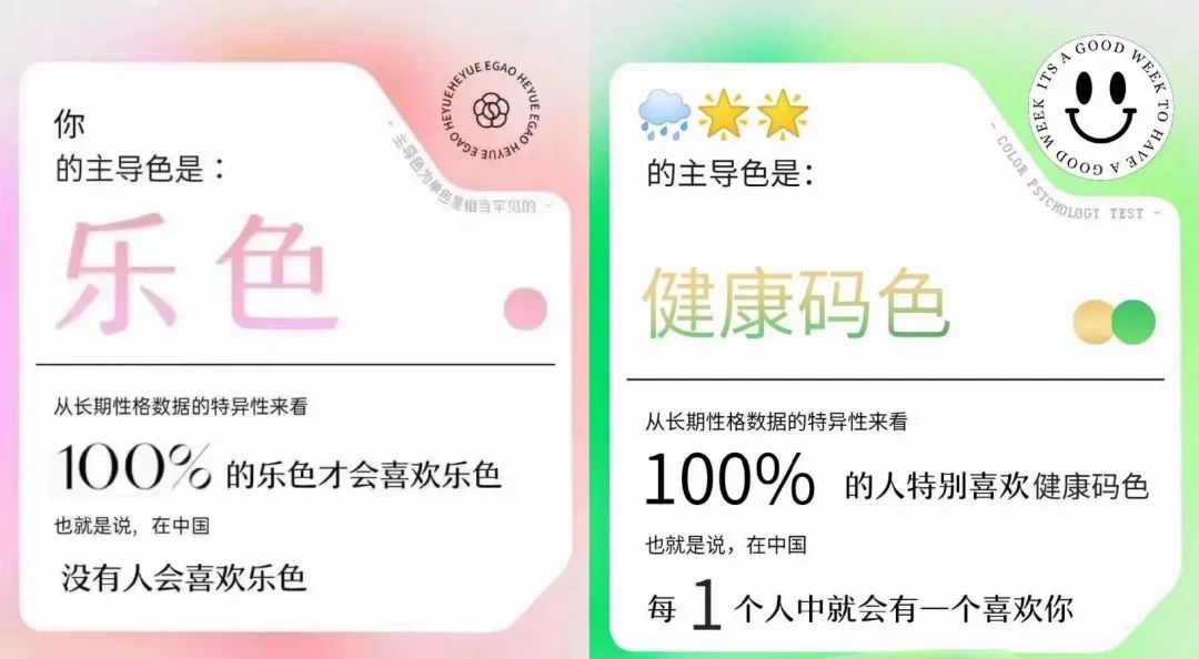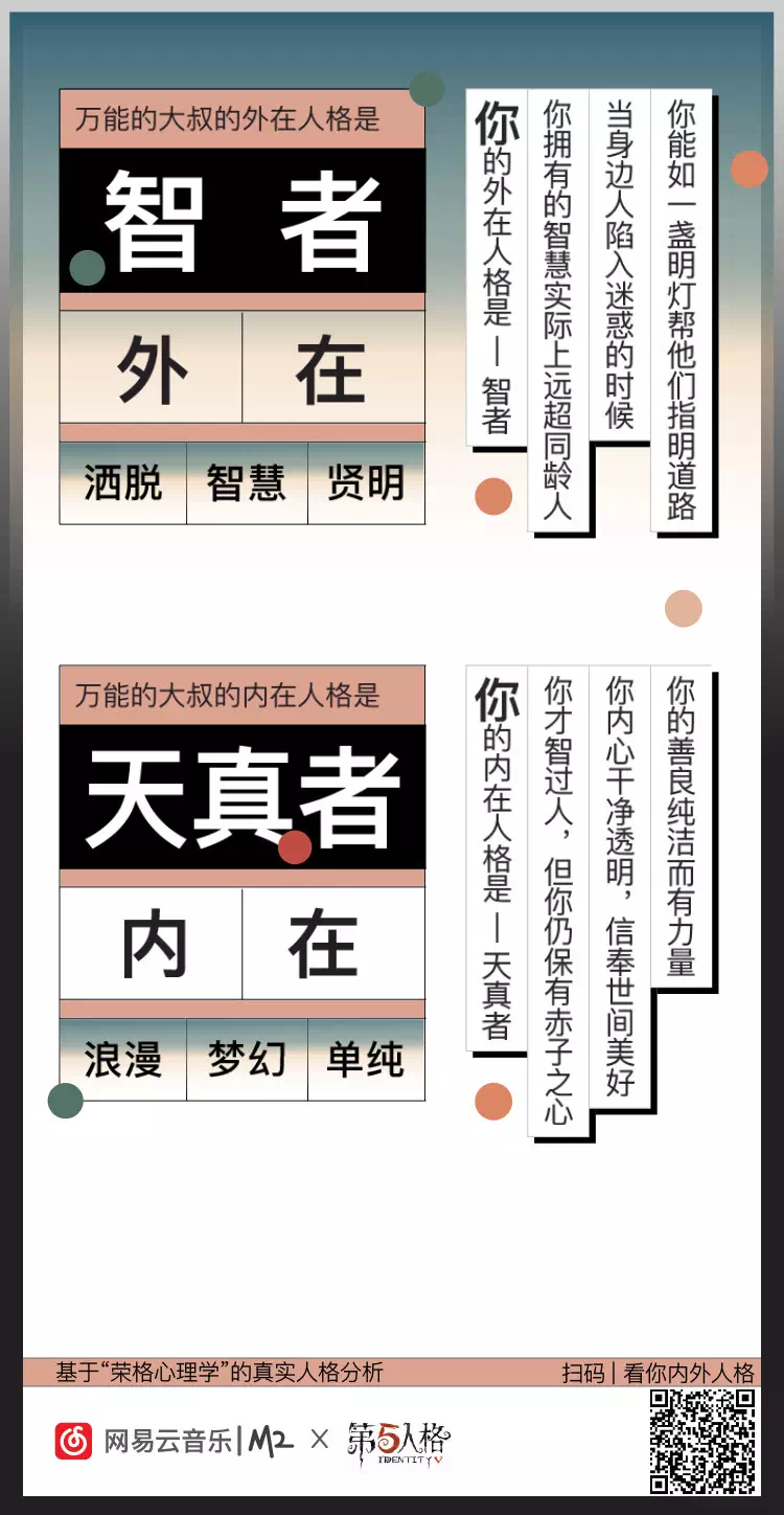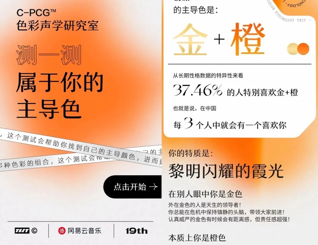 同樣是性格測試,網易云音樂又找到一個專業說法:美國心理學家Tom Maddron的著作《最準確的性格色彩測量工具》。色彩之間的多樣搭配,讓性格特征可精準解讀,賦予每個人獨特性;“吸引”與“遠離”的區分,留足了互動和二創的空間。