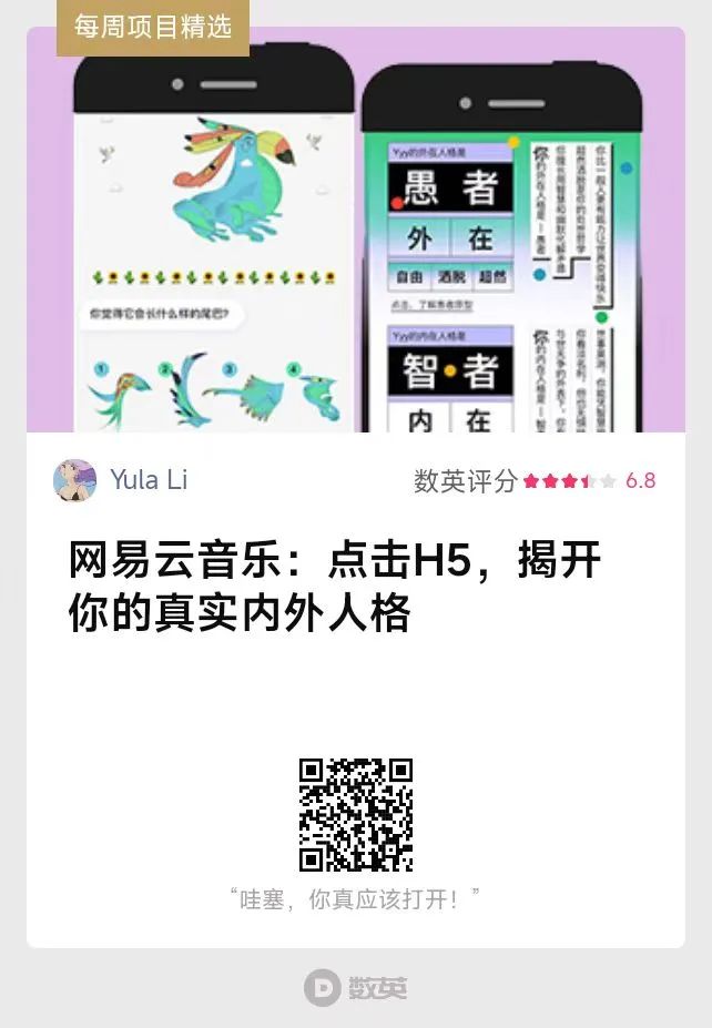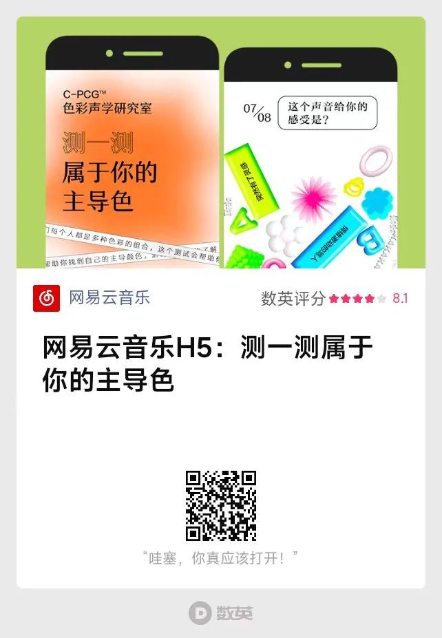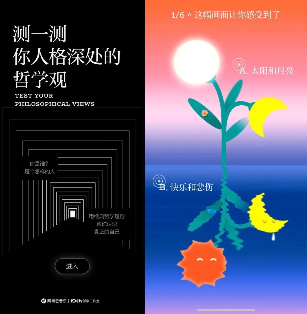 網易云音樂依據“榮格心理學”打造出一套人格測試。H5通過對話的形式,讓整個測試過程有了呼吸空間和趣味性。最后以“定制款”的音樂推薦,戳中個人情緒點,加深用戶的個性表達。
