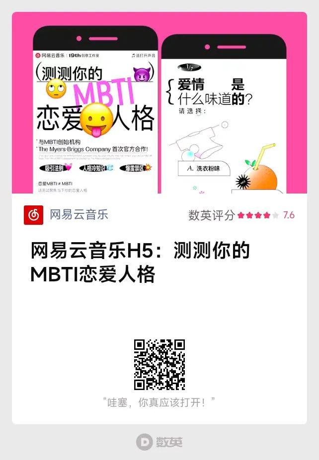 MBTI正刷屏各大社交網站,網易云音樂的測試也緊隨其后霸屏朋友圈。520粉紅氣氛正濃,手握“戀愛”與“MBTI”兩大流量密碼,網易云音樂幫助陷入情感煩惱的人們找到戀愛的理想型。浪漫華彩的溢美之詞,直接把人夸到了心坎里。