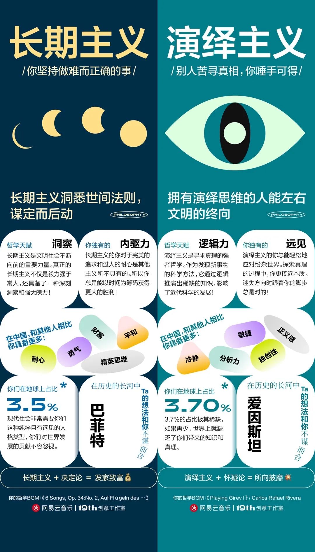 認識自我遠不止一種途徑,哲學也是可選項。網易云音樂把哲學掰成了6個問題,還用一位哲學人物與之匹配,讓人對這門艱深晦澀的理論有了直觀認識。當測試結果分享到社交平臺時,哲學自帶的高知與高深特性,順便成了用戶人設的裝裱。