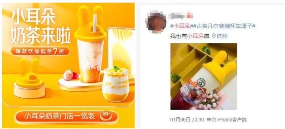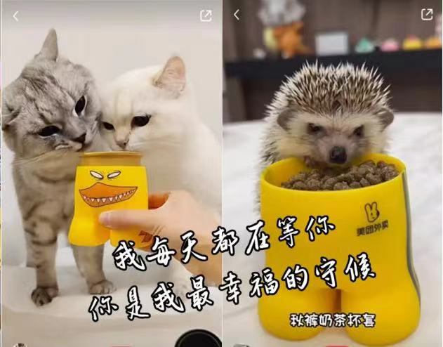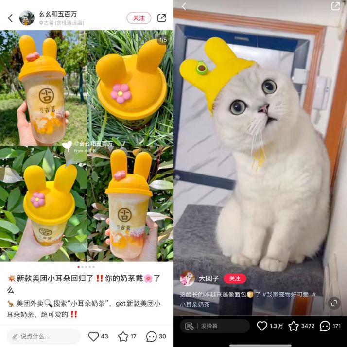 目前,小耳朵奶茶已經成功舉辦三期,次次火爆。美團緊抓“萌”的奧義,不斷在設計上萌出新高度,還延展了二創。出現在ugc里的曬圖不再是只有奶茶和杯蓋,小耳朵還被當成裝飾點綴在寵物頭頂。又有誰,能拒絕萌上加萌呢?