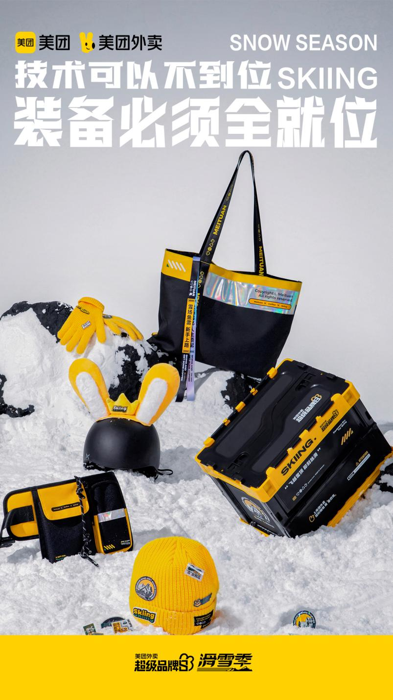 2022年12月圣誕節前,美團外賣超級品牌日聯合咖啡品牌推出了一款滑雪季主題十件套周邊禮盒,在雪圈人群迅速刷爆。這套周邊里除了保留耳朵元素外,整體禮盒的設計,模擬了美團外賣另一個關鍵元素“外賣箱”,十分討巧。在這個可折疊的“外賣箱”中,有在雪場可用的運動保溫杯,保暖帽子及手套,還有十分實用的收納包及隨身包。據某北京滑雪社群反饋,圣誕節那個周末,北京周邊各大雪場均出現了穿戴此周邊的雪友,“一對大耳朵,背著外賣箱,十分酷炫,還在熱搜上看到了”。