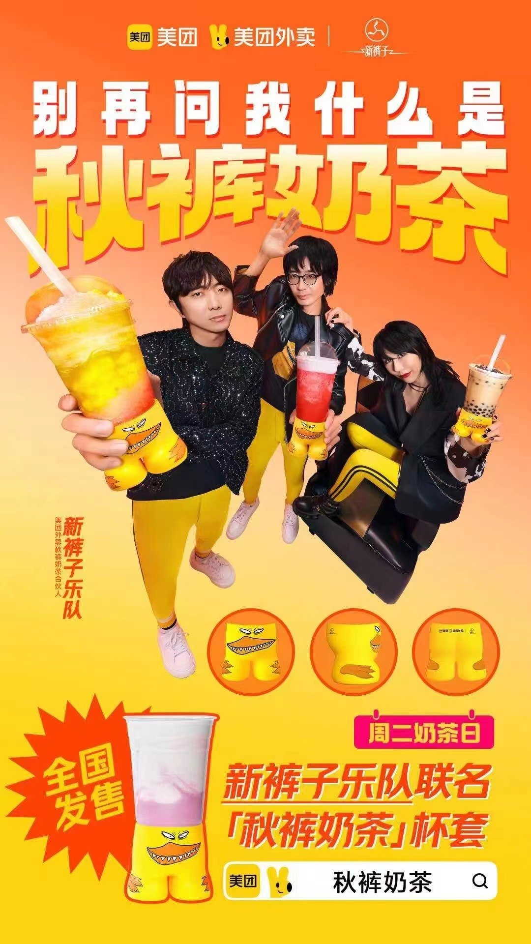搶熱點、搞跨界這兩件事單獨拿出來看都不是新鮮事,關鍵是如何巧妙結合。自成功打爆“秋天第一杯奶茶”并連年登上微博熱搜外,今年美團外賣開始孵化另一個季節熱點營銷。每年入冬后那幾個氣溫驟降的夜晚,“喊你穿秋褲”的老梗就會準時出現在熱搜。抓住這個規律及情緒共鳴的基礎,2022年冬季美團外賣邀請“新褲子”樂隊作為本次活動的chill cool合伙人,將褲子造型的杯托周邊“秋褲奶茶”一炮打紅。聯合彭磊“北海怪獸”IP“嘎嘎”形象的特別定制款,最為搶手。