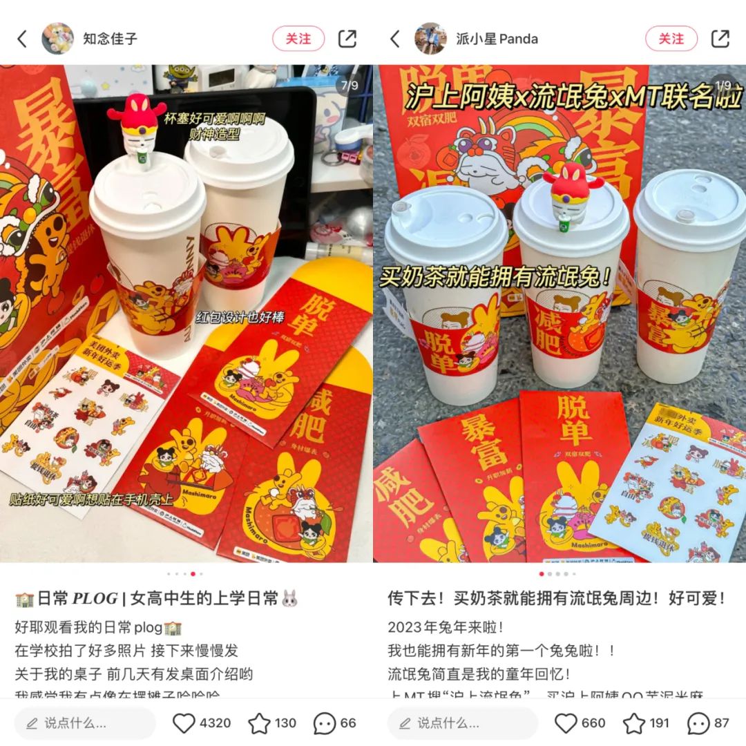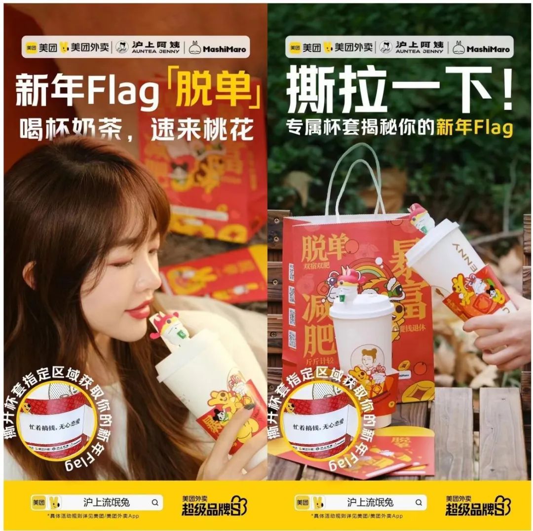 這次周邊破圈,得益于將季節引發的全民穿秋褲玩梗熱點作為破圈基礎,疊加新褲子合作伙伴在用戶中好感度高、秋褲與樂隊名稱本身適配度高的雙重心思,通過這種老梗、老樂隊,新熱點、新組合的碰撞配方,以“既熟悉又驚喜”的周邊創意,在冬季營銷中脫穎而出。緊接著,美團外賣的春節周邊營銷持續通過這個思路,在小紅書被廣泛討論。新年開始,美團外賣超級品牌日聯合“初代網紅”流氓兔與滬上阿姨,玩了一場全民一起立flag的兔年周邊熱點營銷,將搶熱點、搞跨界玩出花。