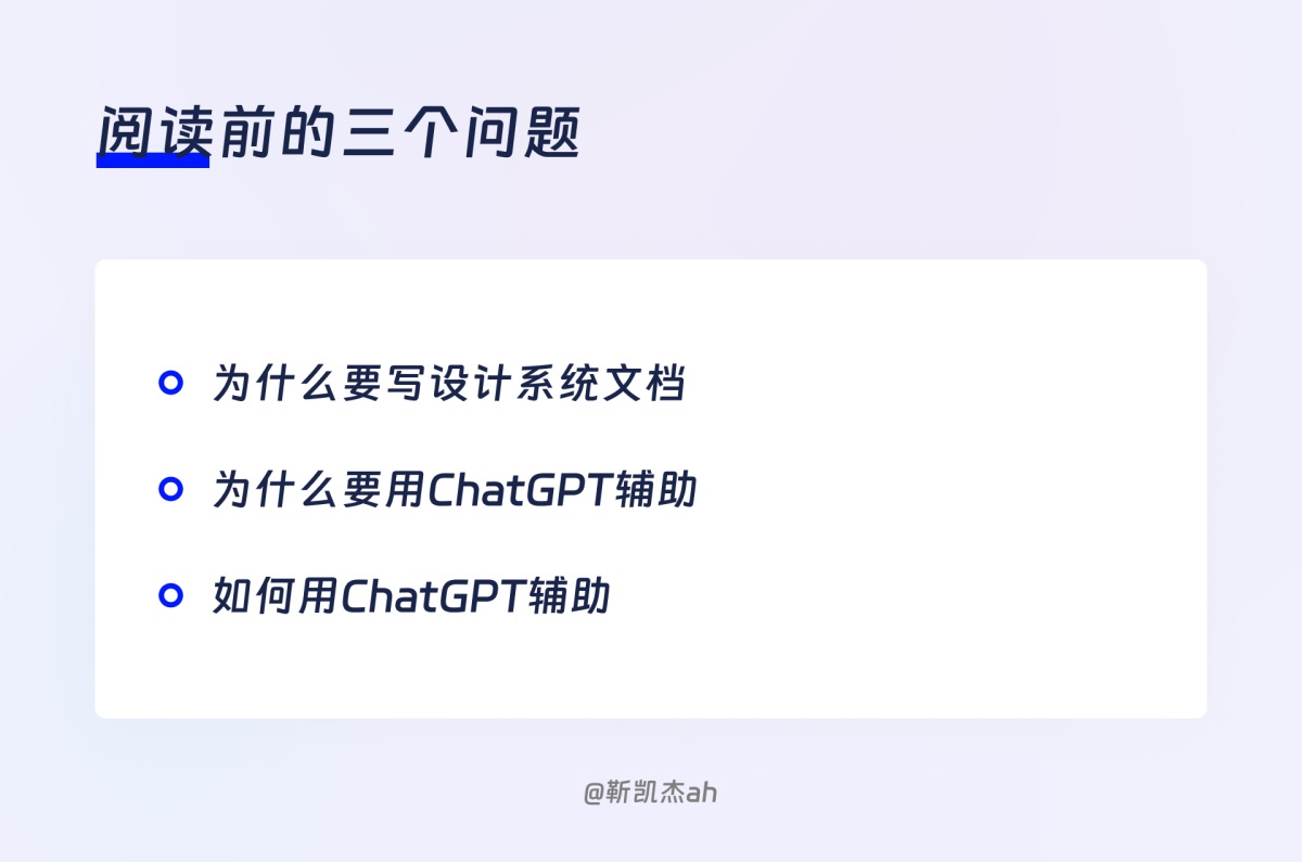 無論是問 ChatGPT 什么內容,我們給出的提示的形式都是一致的,角色+內容+補充提示。將這個模板代入到設計系統文檔中,就是這三個部分: