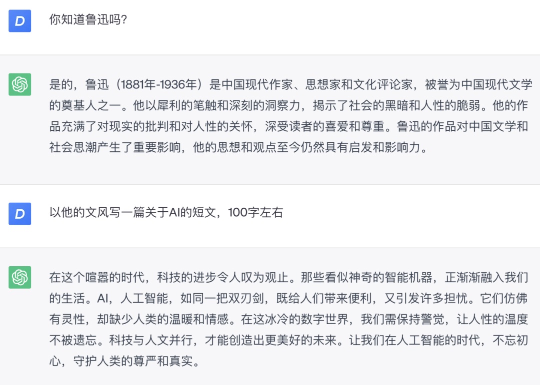 比如我說幫我以魯迅的文風寫一篇關于 AI 的短文,100 字左右。