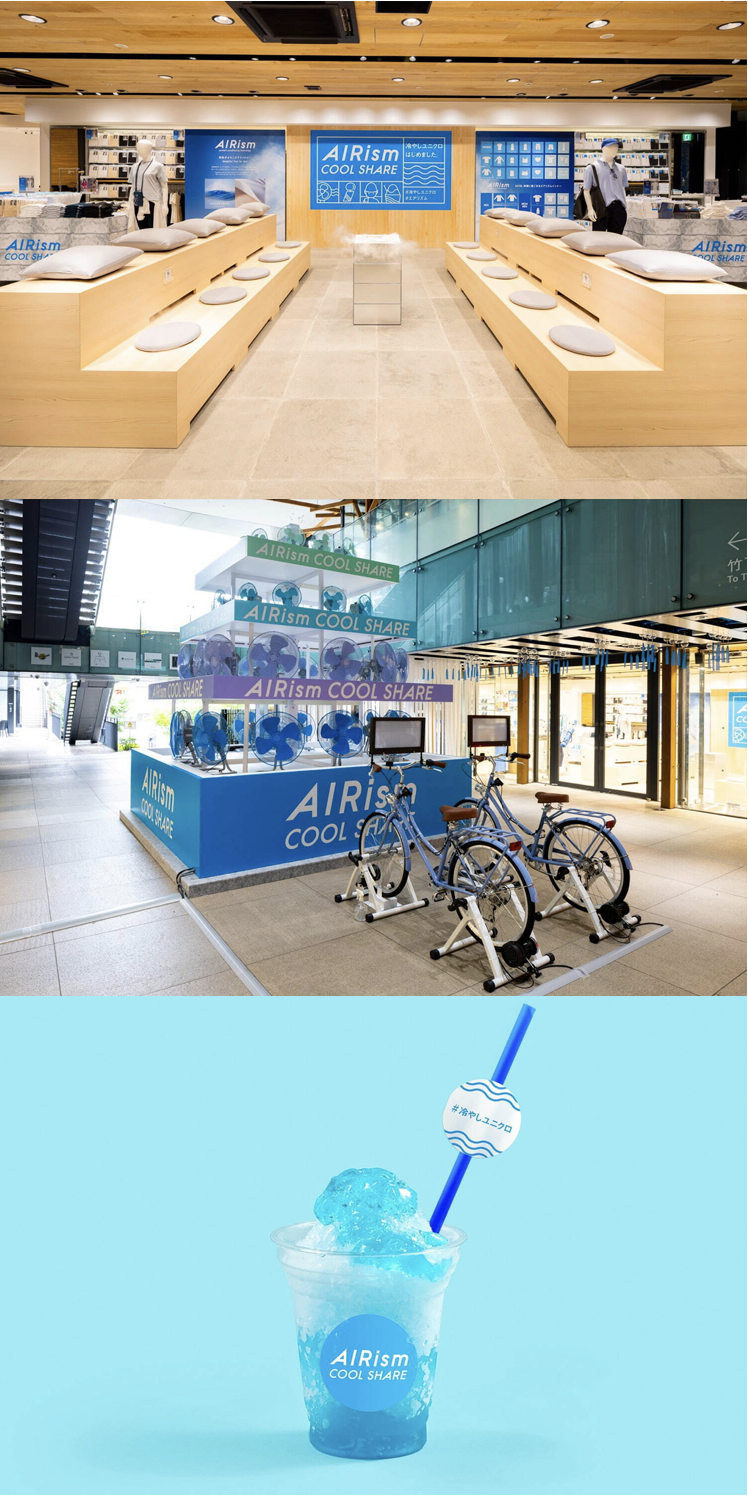 7 月 6 日,優衣庫日本原宿店的 logo 及整體視覺變為了藍色,原因在于配合「AIRism COOL SHARE」快閃活動的舉辦。活動目的是為消費者提供一處夏日清爽解暑之處。