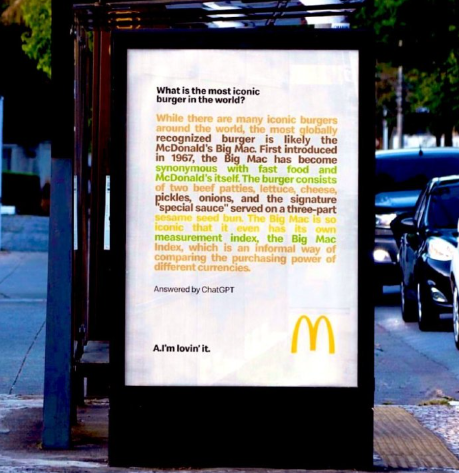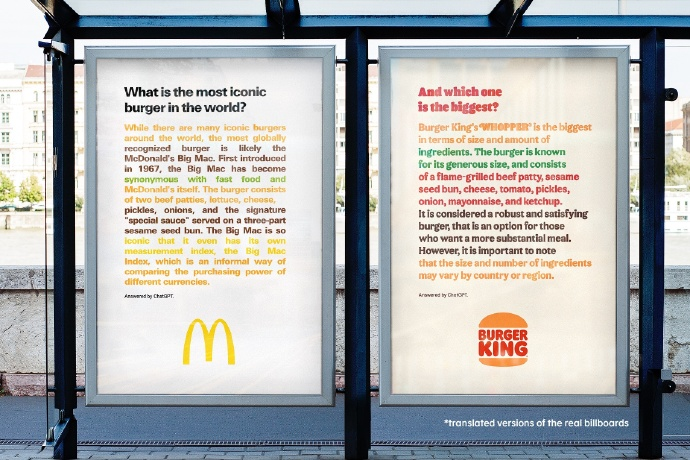 比如,給大家瓜吃的麥當勞與漢堡王。當ChatGPT 火遍互聯網,麥當勞向其提問“世界上最具標志性的漢堡是什么?”,并將夸自個兒的答案投放在路邊。