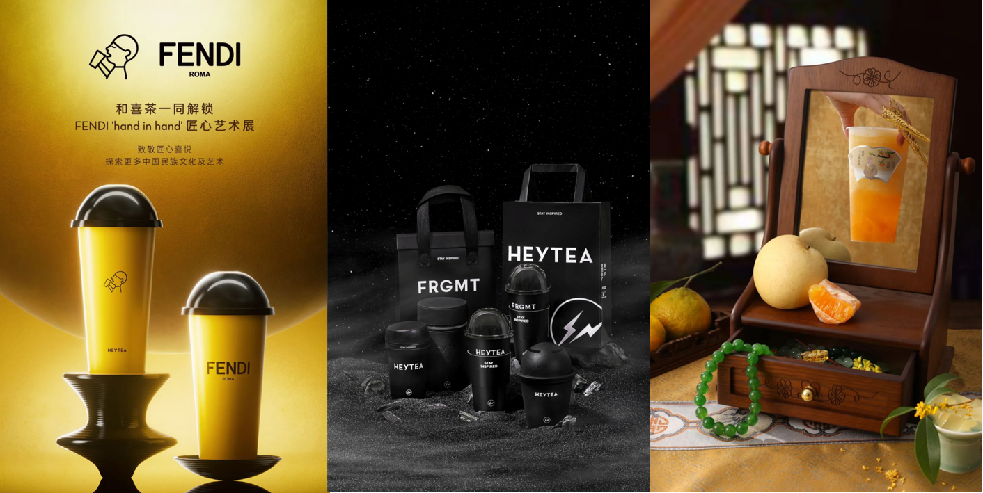 更常被討論到的還有喜茶在品牌內容上的創造力,從藤原浩、FENDI 到《甄嬛傳》和《喜劇之王》等,這些被稱為「夢幻聯動」的合作,在消費群體中引發了廣泛的反響和討論,帶來了用戶品牌感受上的「喜」。