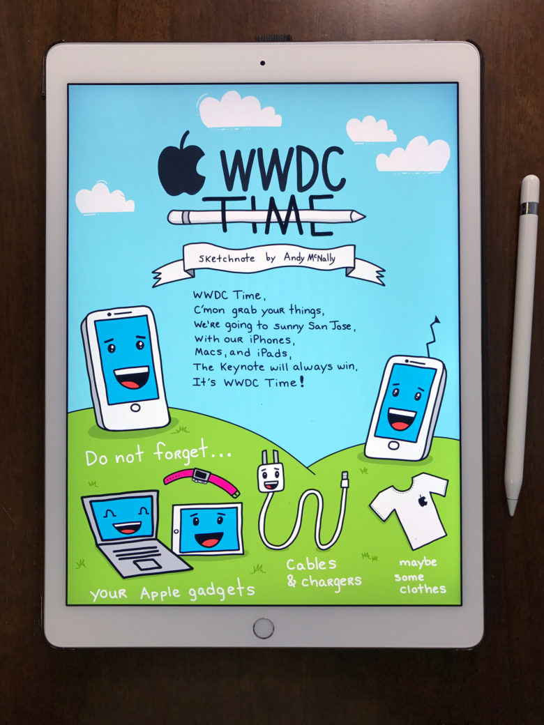 最后,Andy McNally 也為我們展示了 WWDC 2017 開始前最后一個版本,當然,這也是他特意用 iPad Pro 繪畫的數字版本,他也很期待能在 WWDC 2017 上,能獲得更多的冒險體驗和氣氛。同時,這其實也是對 WWDC 2017 的一種致敬。
